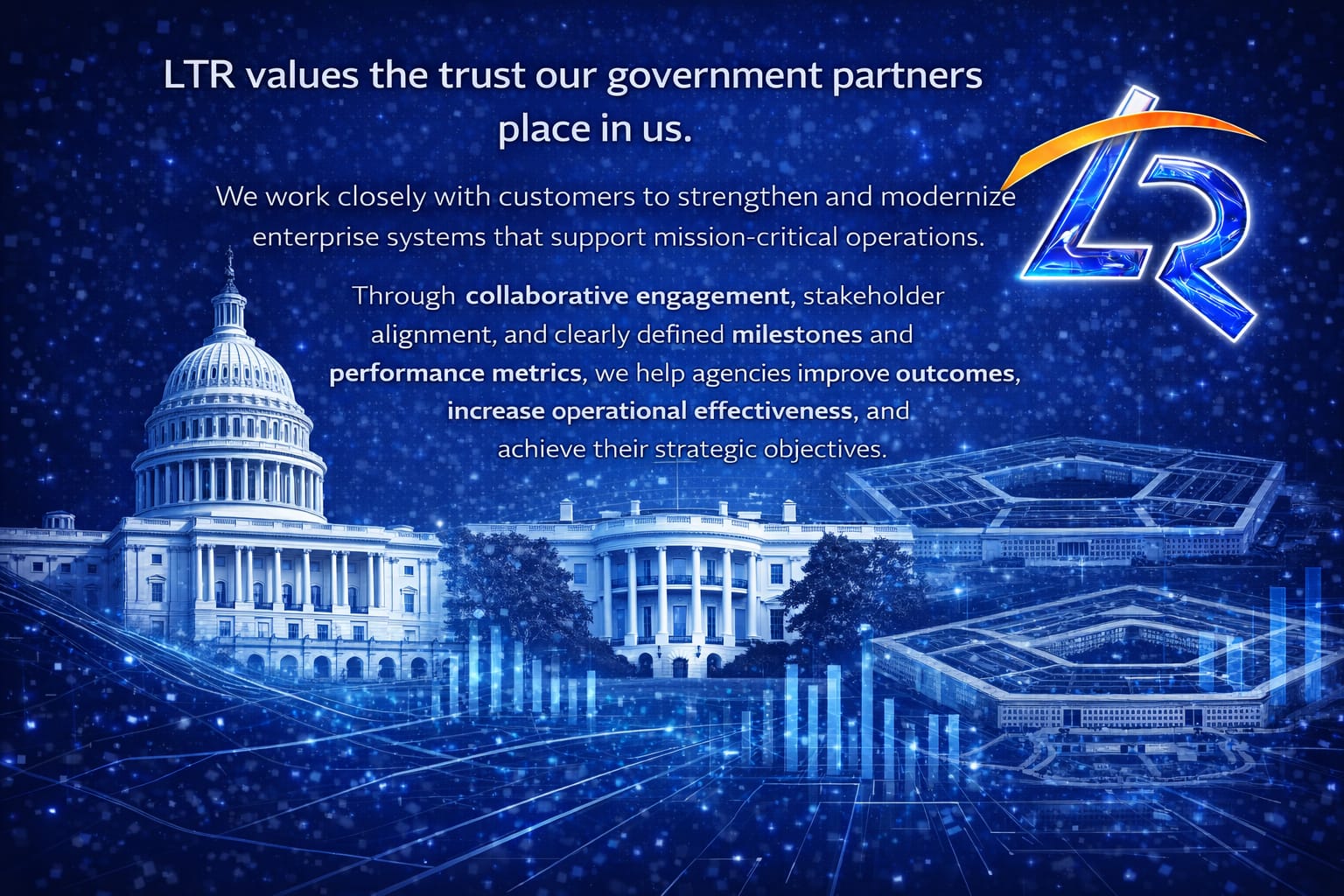 LTR’s senior leadership team brings more than a century of combined experience supporting government missions and operating within complex federal, state, and local enterprise environments. With firsthand knowledge of government systems, modernization initiatives, and acquisition processes, our leaders guide project teams and subject matter experts to deliver solutions aligned with agency priorities, operational requirements, and measurable mission outcomes.
